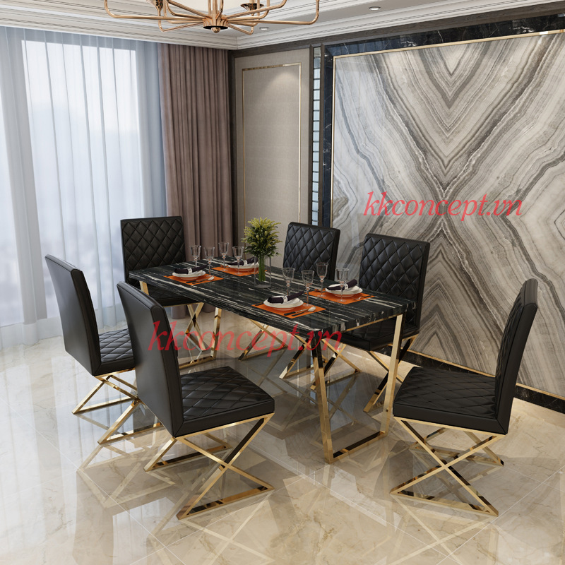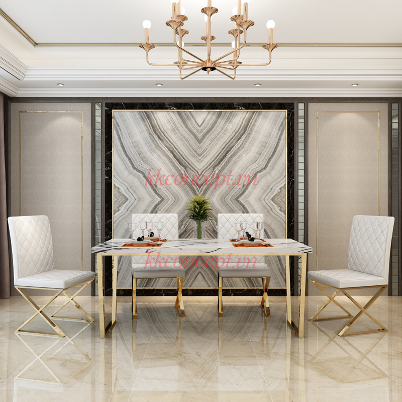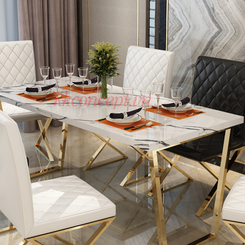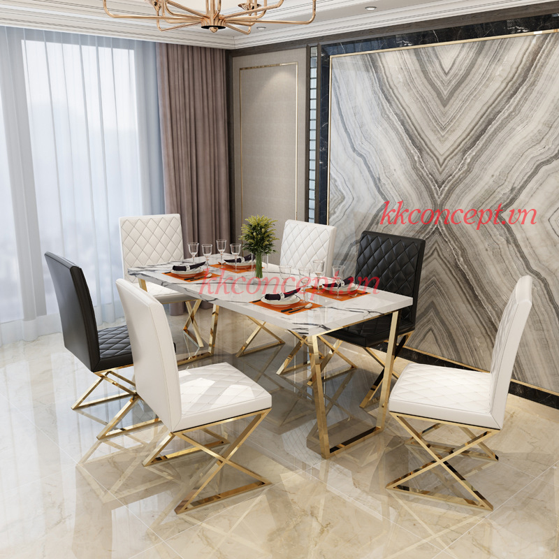 - Chất liệu: Bàn ăn khung inox mạ vàng, mặt đá marble.