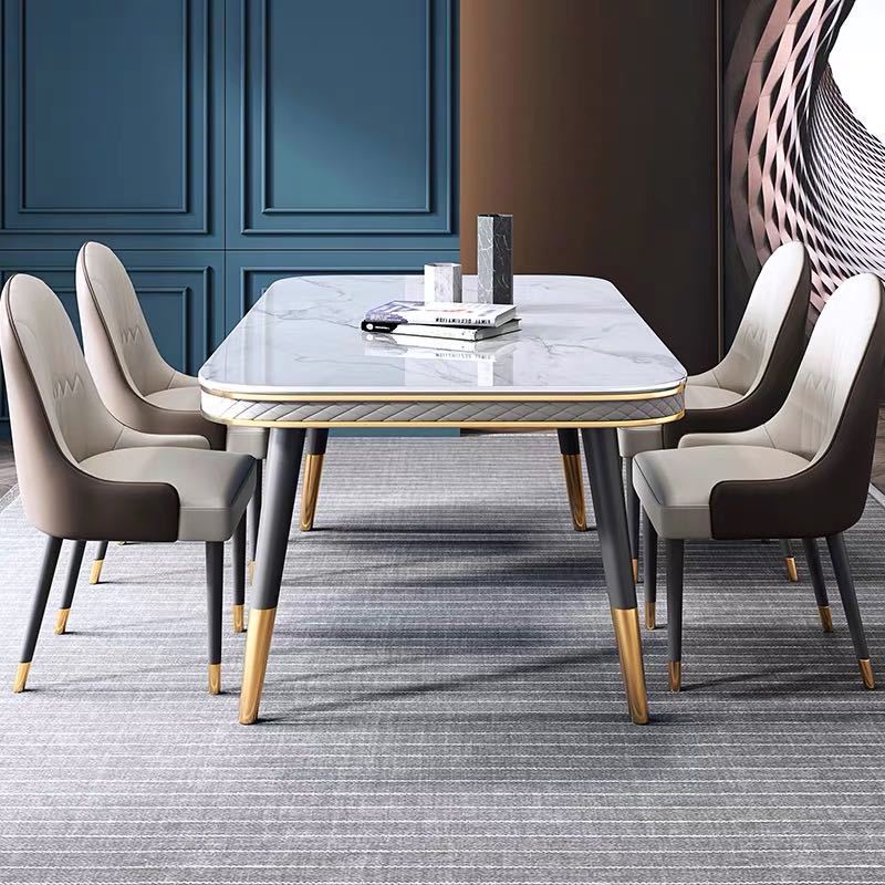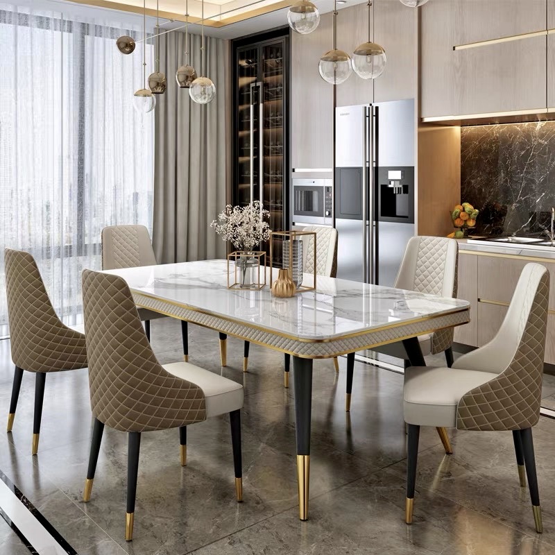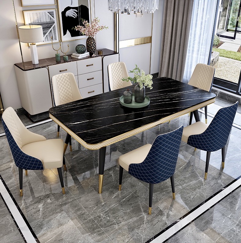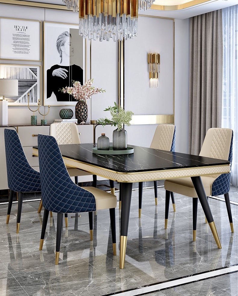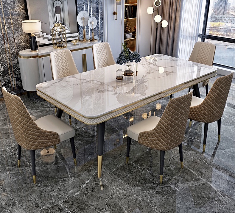 Bàn ăn mặt đá marble nhân tạo, khung sắt, nẹp inox mạ titan vàng BA112 nhập khẩu