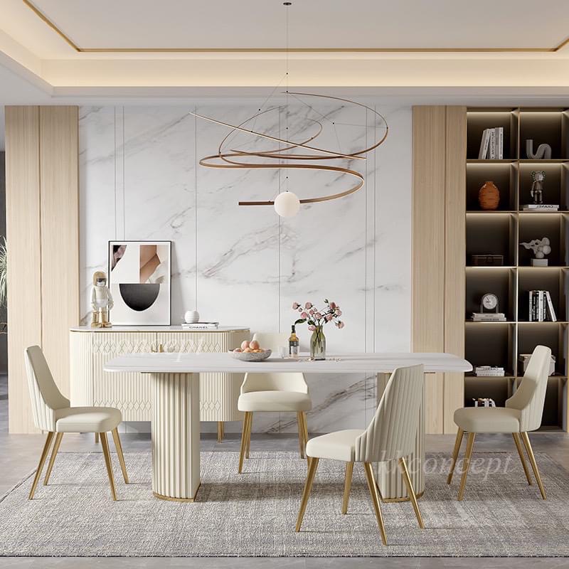 - Chất liệu : mặt đá marble nhân tạo, chân bọc da , viền inox mạ titan vàng