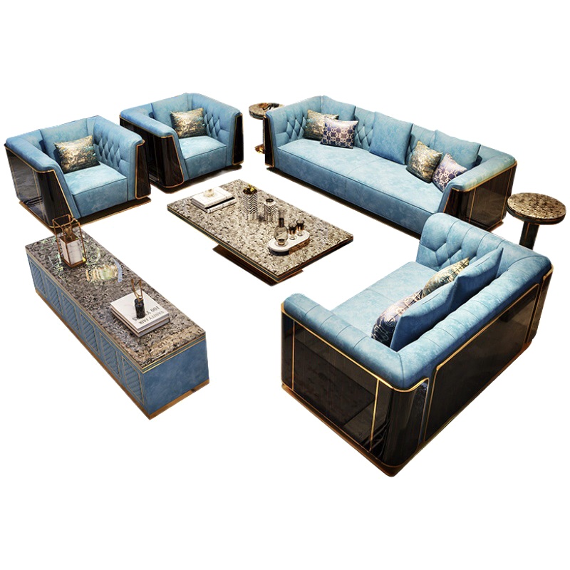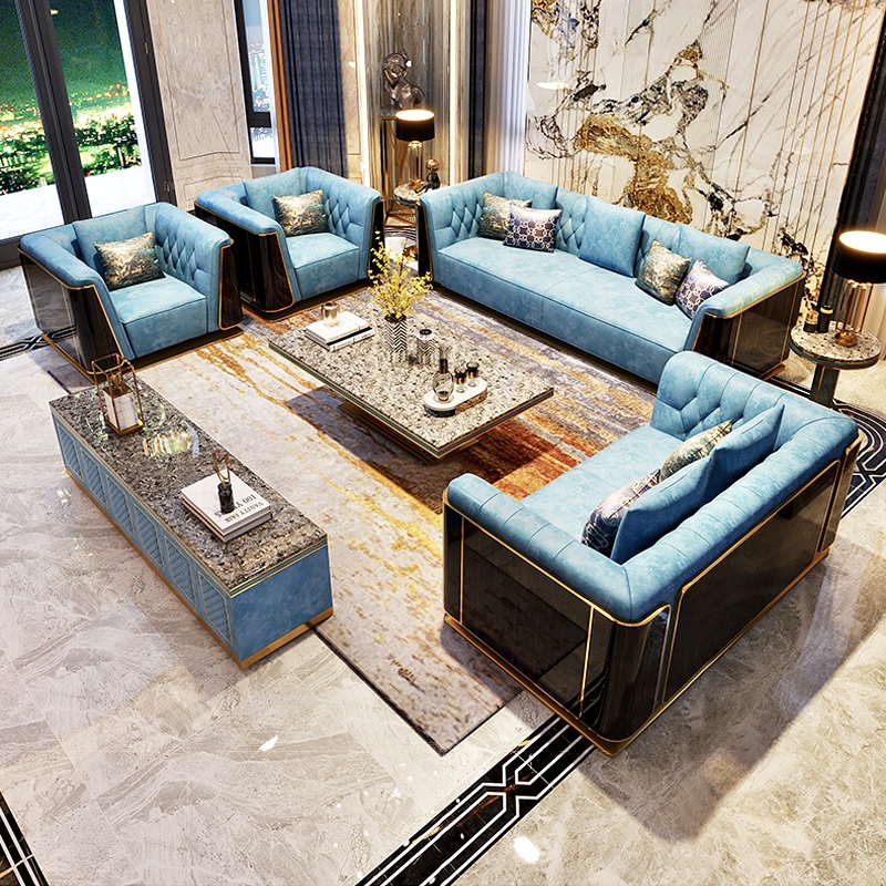 Bộ Sofa da bò màu xanh và gỗ sơn bóng piano nhập khẩu caoBSF191