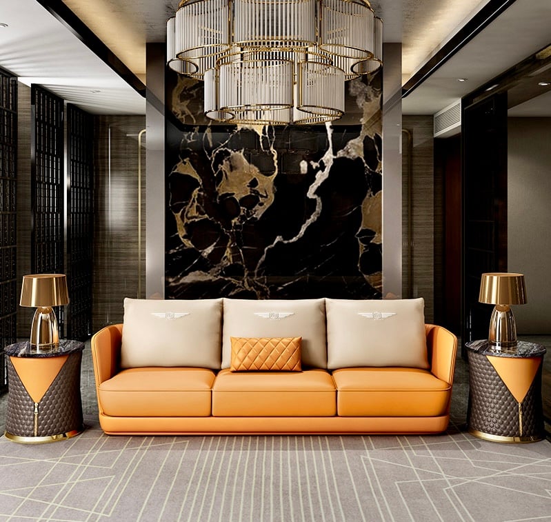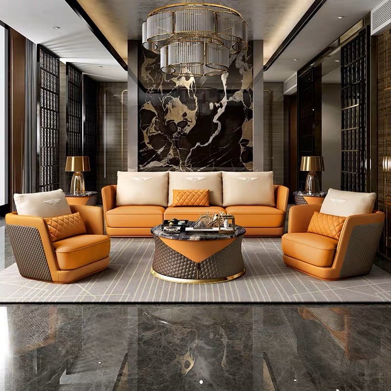 Bộ sofa da sang trọng phong cách kiểu italy nhẹ nhàng sang trọng cao cấp dành cho phòng khách cao cấp với chất liệu bằng da chân, viền inox mạ titan vàng, phong cách Ghế sofa Bentley sang trọng nhẹ của Ý.