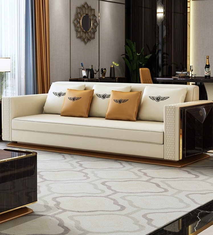 - Chất liệu : Da Bò lớp trên cùng cao cấp, gỗ bạch dương sơn piano, nẹp inox mạ titan vàng.