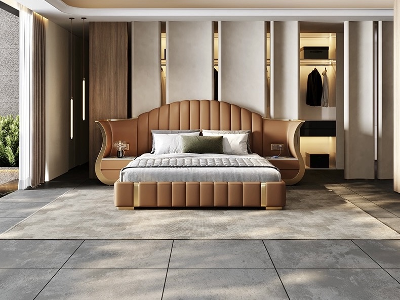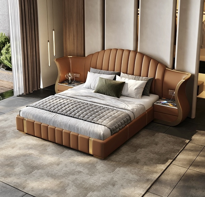 + Chất liệu: Khung gỗ , Bọc da bò tiếp xúc, viền inox mạ titan vàng, ổ cắp điện, tab đầu giường